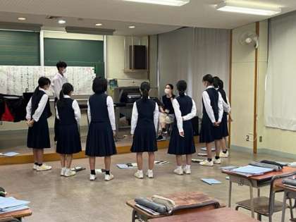 写真上:3年3組 音楽 ※合唱練習でパート毎に先生からアドバイスを受けています。