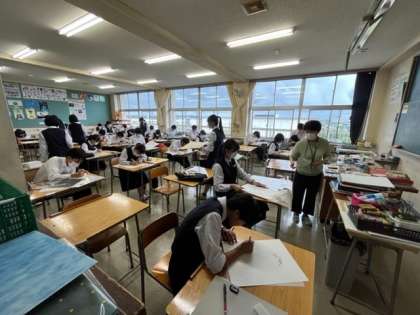 写真下:3年1組 美術 ※『将来の自分 今の自分』の自画像を制作中です。