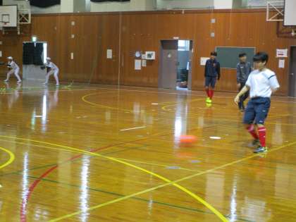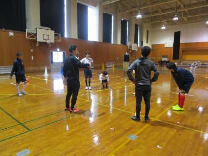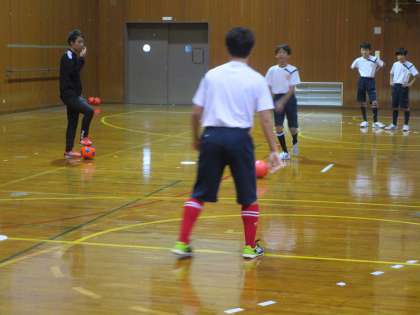 今日は体育館での練習です。課題はボールの足さばき。皆、素早い動きを特訓中。