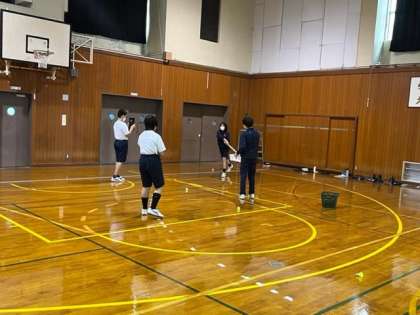 写真中:1年2組 体育 ※グループでバッティングフォームの動画を撮影しています。