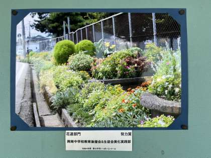 地域ボランティアの方々と美化実践部が協働して整備しているグラウンド南側のフラワーロード。毎年参加している富山市花いっぱいコンクールで、努力賞を受賞し、昨日受賞式が行われました。