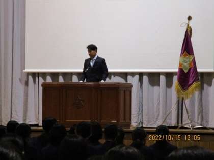 創校40周年記念式典 その1 公開日 2022/10/16 更新日 2022/10/16 今日の興南中 10月15日(土) 本校の創校40周年を記念式典が、多くの来賓の皆様方をお招きして盛大に行われました。 教育後援会会長様、育友会会長様からお祝いのお言葉をいただきました。