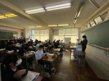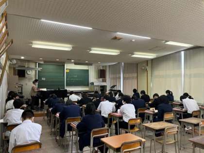 写真中:2年2組 音楽 ※『合唱コンクール』で録音した自分たちの合唱を聞いています。