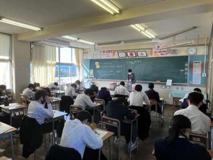 写真上:2年1組 国語 「便覧を見て、しっかりと復習しておいてください。」