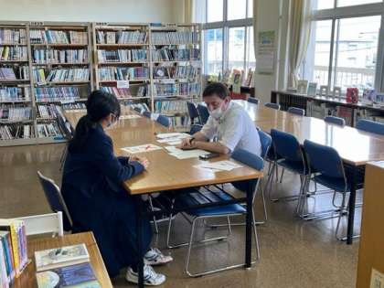 写真中:1年2組 英語 ※マーク先生とスピーキングテスト中です。