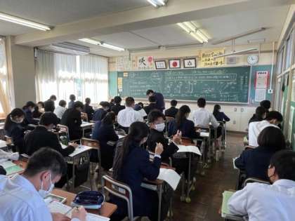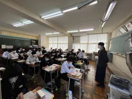 写真下:3年3組 英語 「『出口』を英語で何という? 最近よくテレビで出てますよね」