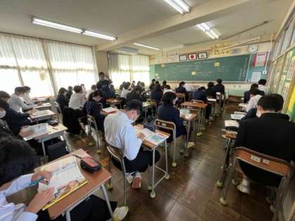 写真中:3年2組 保健 ※ワークを使って、今日の学習をまとめています。