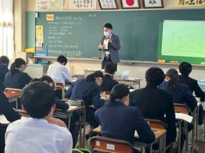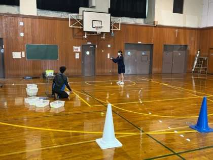 写真中:3年2組 体育 ※バッティングの実技テストを行っています。