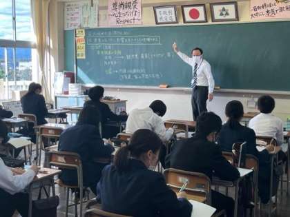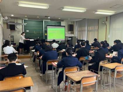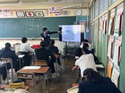 写真下:2年3組 社会 「宮崎県はキュウリの出荷が冬場に多くなっています」