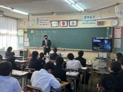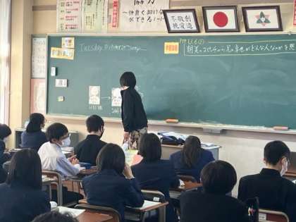 写真上:1年1組 英語 「『彼 He』の場合は『play』が『plays』になります。」