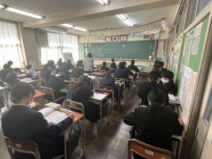 写真中:1年2組 数学 「問題、解けましたか?もう1分だけ延長しま〜す。」