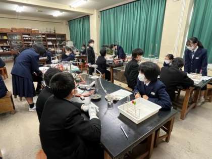 写真中:1年2組 理科 ※蒸留の実験しています。