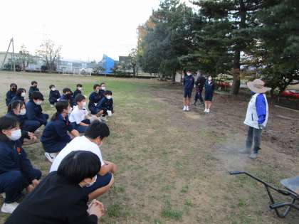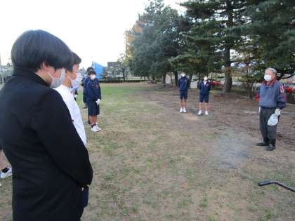 (写真 上:坂田教育後援会会長の挨拶 中:美化実践部長の挨拶 下:作業の説明の様子)