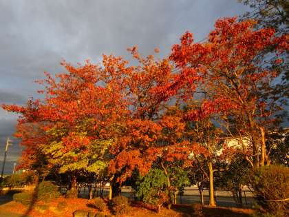 11月8日(火) 7:10 雲間から差し込む朝日に映えて前庭の木々の紅葉が美しいです! 深まる秋を感じますね。
