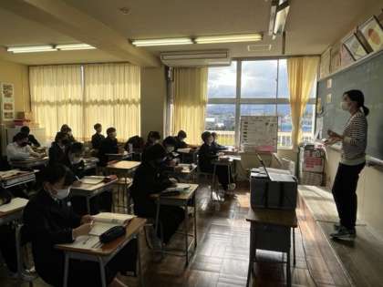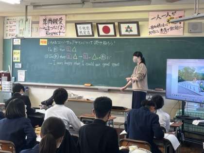 写真中:2年2組 英語 「a difficult time は 困難な時間という意味です」