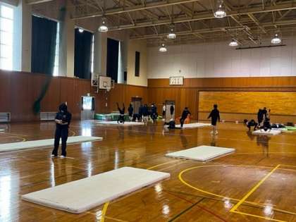 写真下:2年3組 体育 ※ 倒立前転を行っています。