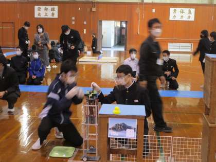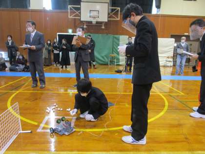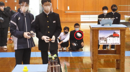がんばれ!ロボ魂!・その4 公開日 2022/11/14 更新日 2022/11/14 今日の興南中 11月12日(土) 午前 興南中学校のチームどうしの対決です! 2年生チーム「ロボコンに導かれし者たち」VS1年生チーム「あぶりさーもん」 (写真 上:あぶりさーもん 中:ロボコンに導かれし者たち) (写真 下:2年生チーム、ボールを発射(赤い○の中) めざせ、雄山!)