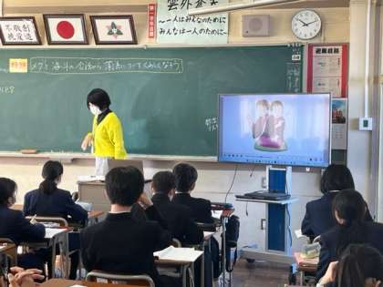 写真上:1年1組 2限 英語 「落語は『japanese comic storytelling』です」