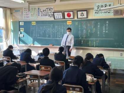 写真中:1年2組 2限 国語 「まとめを原稿用紙に2段落構成で書きましょう」