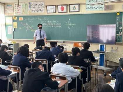 写真下:1年3組 3限 理科 「レンズの中央を通る光は曲がりません」