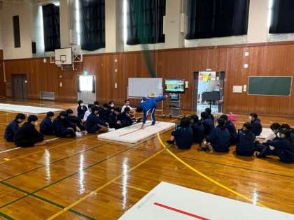 写真下:2年3組 体育 「側転をするときは手を遠くにつくようにするといいです」