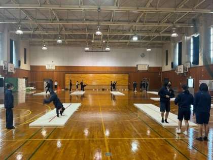 写真中:2年2組 3限 体育 ※側転の練習をしています。