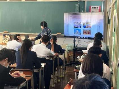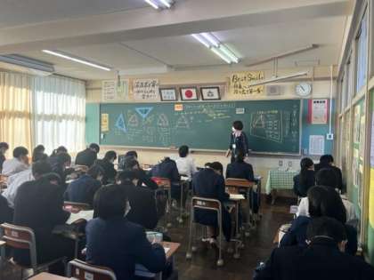 写真中:3年2組 数学 「AD:AB=AE:ACならばDE//BCとなるか 考えて!」