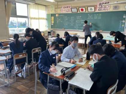 写真上:2年1組 国語 ※課題作文に取り組んでいます。