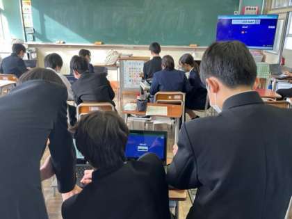 写真下:2年3組 英語 ※クロムブックで英語クイズにチャレンジしています。