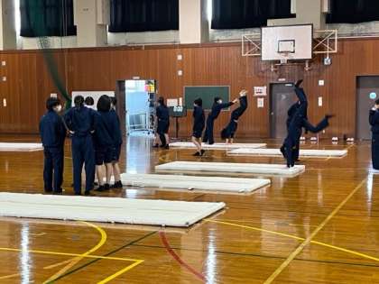 写真下:3年3組 体育 ※倒立前転の練習中です。