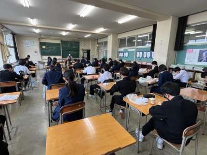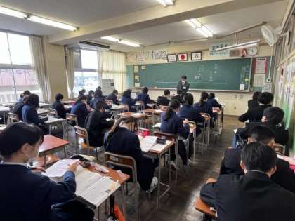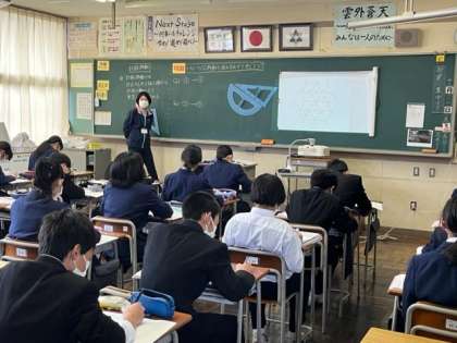 写真下:1年3組 数学 「対称移動をつかって図形を移動する方法を考えてみましょう」