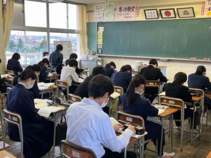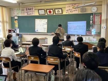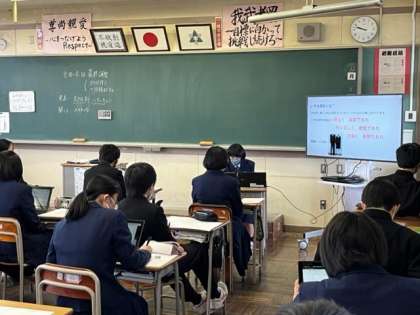 写真中:2年2組 総合 ※進路学習で高校しらべの発表を行っています。