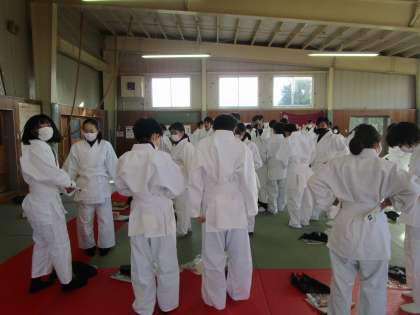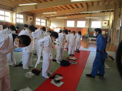 1年1組・保健体育 公開日 2022/12/05 更新日 2022/12/05 1年生 12月5日(月) 1限 1年1組の1限の授業は保健体育です。 今日から柔道の授業が始まりました。 真新しい柔道着に袖を通しました。 まずは帯の締め方から学びます。