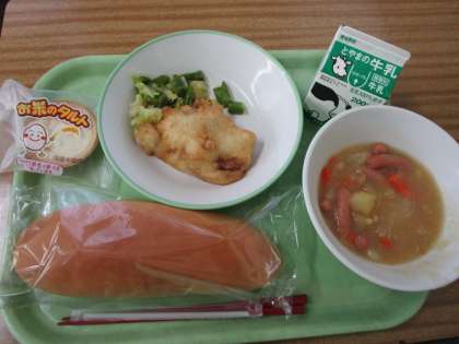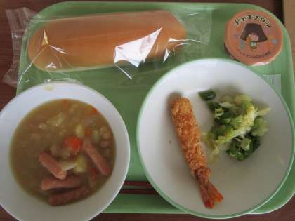 (写真 上:主菜 えびフライ デザート チョコプリン )
