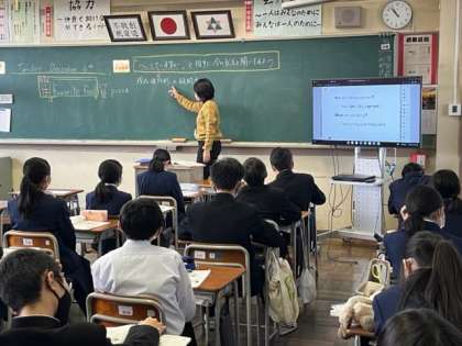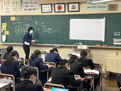 写真下:1年3組 数学 「一点からの距離が一定である点の集まりが円です」