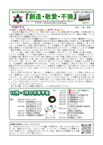 学校だより7号 公開日 2022/12/09 更新日 2022/12/09 お知らせ 12月9日(金) 本日、「学校だより7号」を配布しました。 右「配布文書」からも見ることができますので、是非ご覧ください。