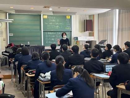 写真上:3年1組 音楽 「高校へ行ったら音楽という授業が無いかもしれませんよ」