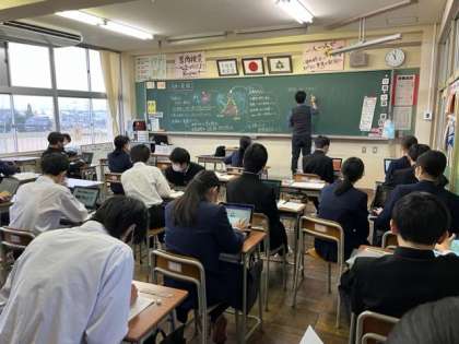 写真上:2年1組 理科 「クロムブックを出して、黒板に書いたページを検索してください」