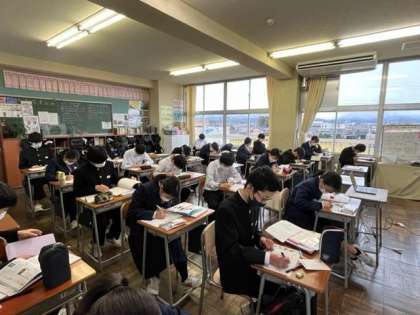 写真上:2年1組 国語 ※書き初め「白梅の香」を硬筆で練習しています。