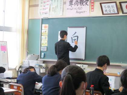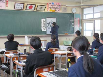 2年3組・書き初め練習 公開日 2022/12/19 更新日 2022/12/19 2年生 12月19日(月) 1限 今日は2年3組が書き初め大会の練習をしました。今年は「白梅の香」と行書で書きます。 ほとんどの人が毛筆で行書は初めてなので、お手本として水書板で4人の人に1文字ずつ書いてもらいました。 勢いよくのびのびと書く人や一画一画お手本を見ながら慎重に書く人など書き方は様々でした。 今日見たことを思い出しながら、冬休みの練習に励んでくださいね。
