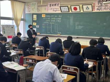 写真上:2年1組 数学 「『X>=5ならばX>3』の逆は正しいか正しくないか」