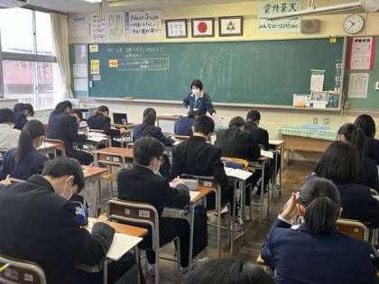 写真中:1年2組 英語 「3学期はリーディングテストを行います。音読です!」