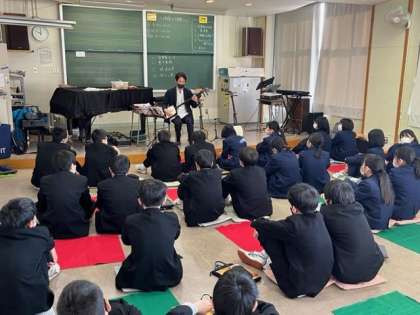 写真上:2年1組 2限音楽 ※三味線の先生の演奏「茄子と南瓜」を聴いています。