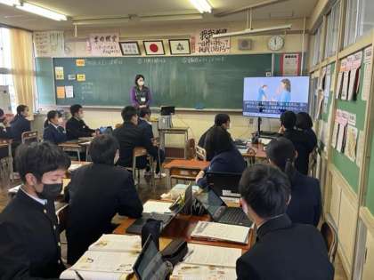 写真中:2年2組 英語 ※『A Glass of Milk』の英語朗読を聞いています。