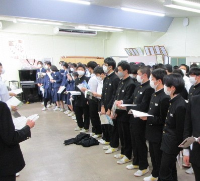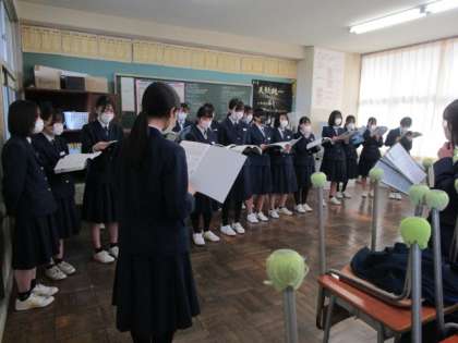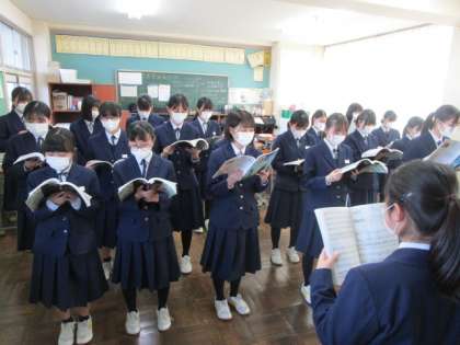 卒業生合唱「大地讃頌」学年練習 公開日 2023/01/21 更新日 2023/01/21 3年生 1月20日(金)6限 卒業式に向け、いよいよ合唱練習がスタートしました。これまで授業でクラス毎に練習していたものを、今日は学年で合わせて歌いました。 まだ音程が不安なところも多いですが、皆やる気に溢れています。感動的な合唱に仕上がるよう、心を込めて練習します。 写真上 ソプラノパート練習 写真中 アルト パート練習 写真下 合唱