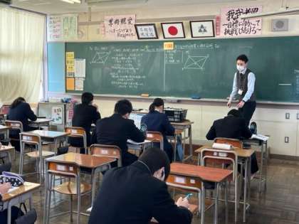 写真中:2年2組 数学 「平行四辺形の性質を使って証明しよう!」