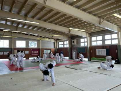 写真下:2年3組 体育 ※『大腰』という投げ技の練習中です。
