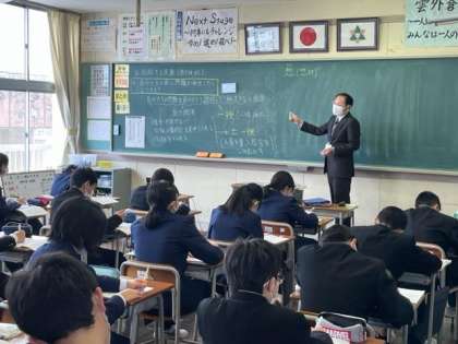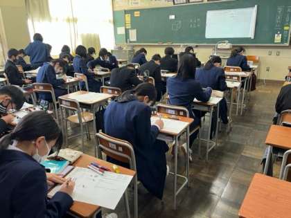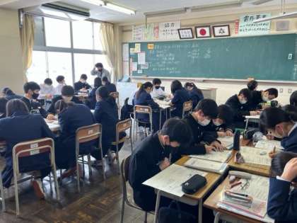 写真上:1年1組 理科 ※『地震の伝わり方』の問題に取り組んでいます。ほぼ数学です。