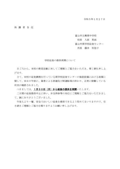富山市教育委員会学校保健課から「給食再開のお知らせ」がありました。