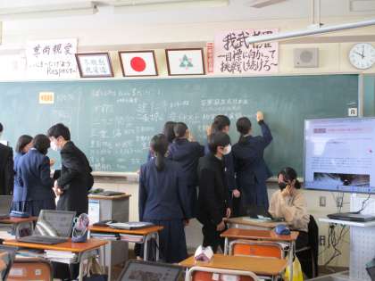 まず初めにクロムブックで京都の観光名所を調べ、次々と黒板に書き出しました。